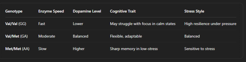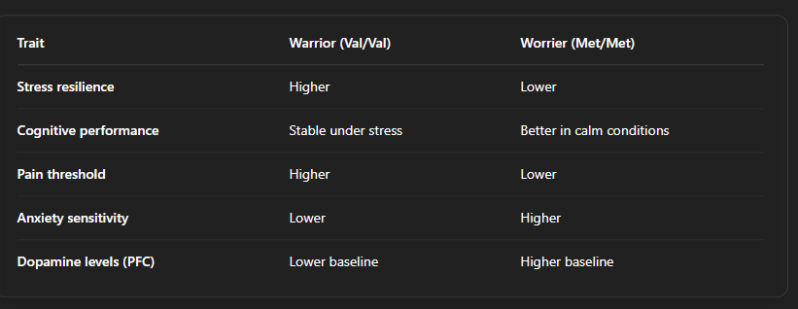 ✅ A Val/Val (Warrior) breaks down dopamine quickly → lower levels but better under pressure.